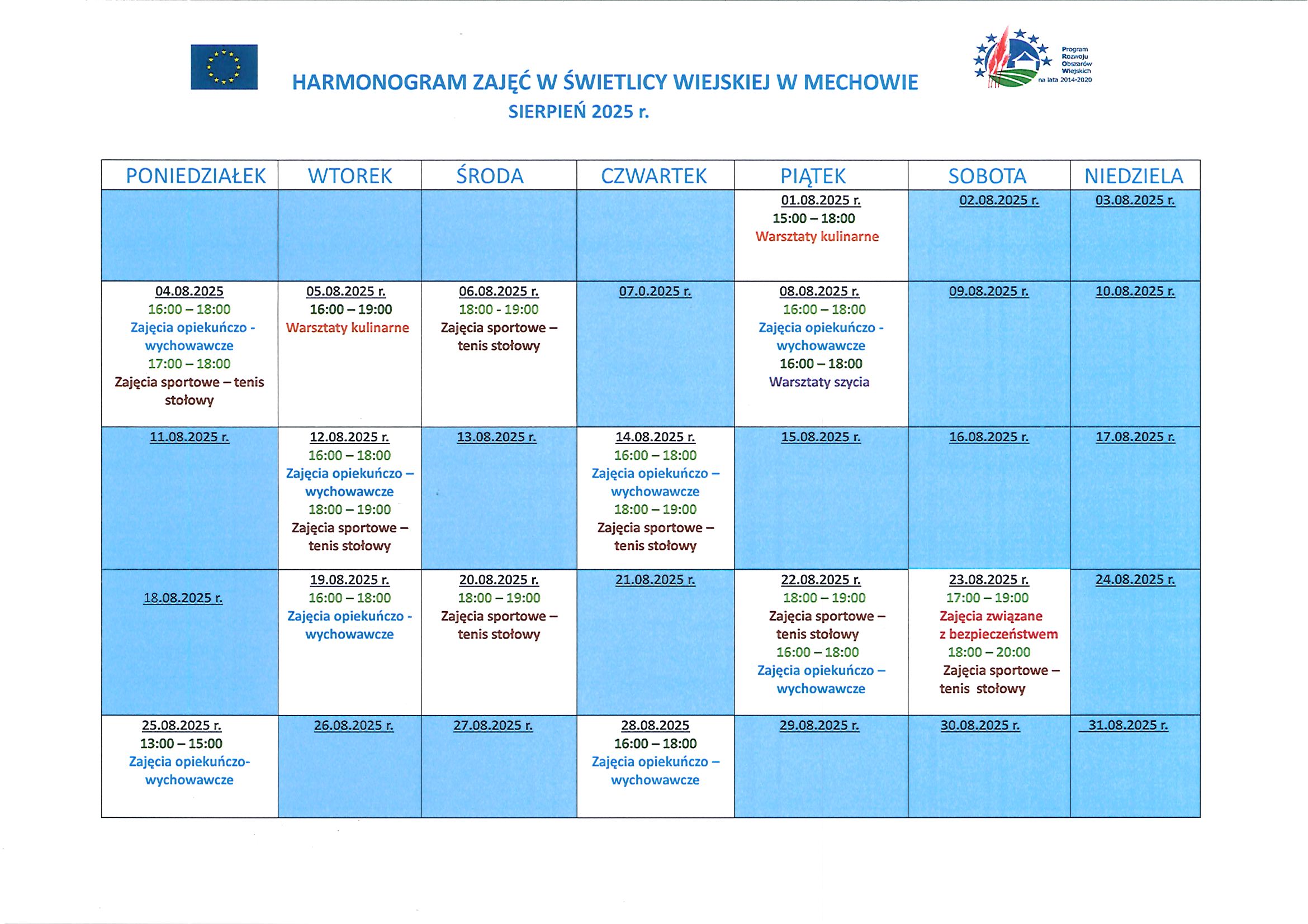 Harmonogram zajęć w Świetlicy Wiejskiej w Mechowie na sierpień 2025